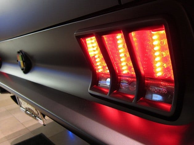 The car is a vehicle for that. West Coast Customs took a 2012 Ford Mustang and retrofitted it with a 1967 Mustang fastback replica body. They painted the car matte black, and decked it out with neon blue lights in the grill and around the rims.