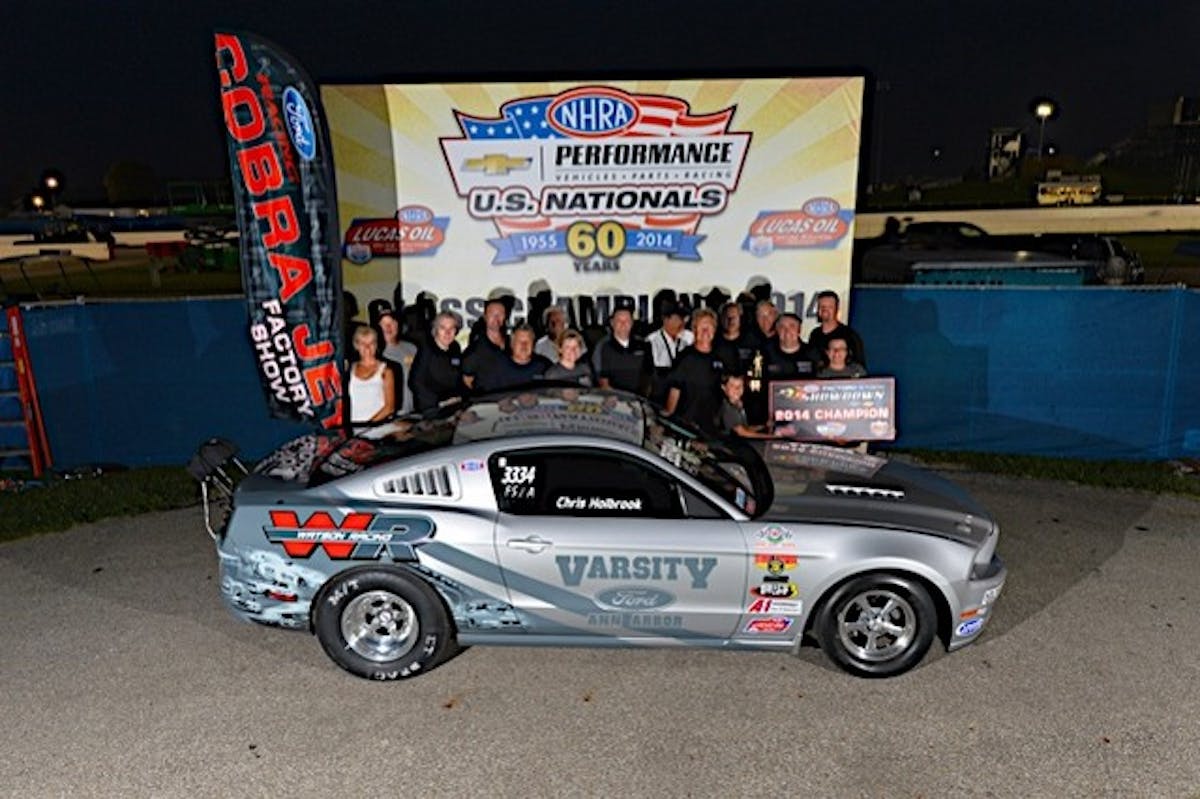 Cobra Jets also represented in the Factory Stock Showdown, Friday night of the U.S. Nationals with Chris Holbrook taking the highest honors. Holbrook defeated Bruno Massel and his 2014 COPO Camaro during the supercharged factory engines (FS/A) final. He then beat out Kevin Helms and his 2011 Dodge Challenger race car in the final overall Factory Stock Showdown race with an 8.694-second quarter mile at 154mph. Helms ran a 9.029-second quarter mile at 147mph in the final race.