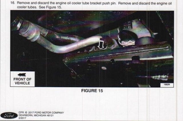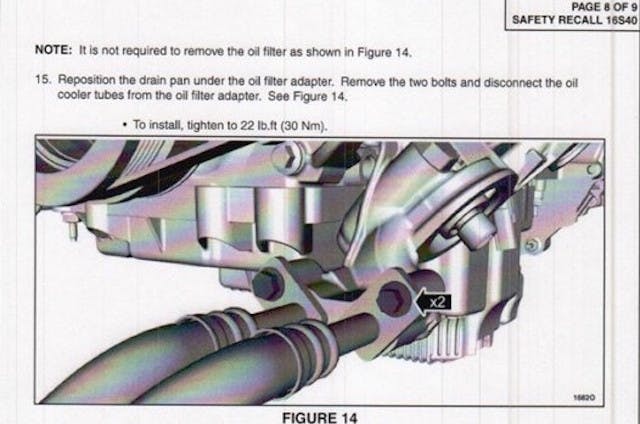 As you can see from the picture from the actual Ford safety recall 16S40 above, the hoses that are being replaced are those in front of the engine. These hoses run from the oil filter housing to the oil cooler radiator assembly. This recall calls for replacing the entire hose assembly with updated versions to keep your engine safe from oil leaks and lost oil pressure.