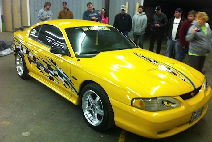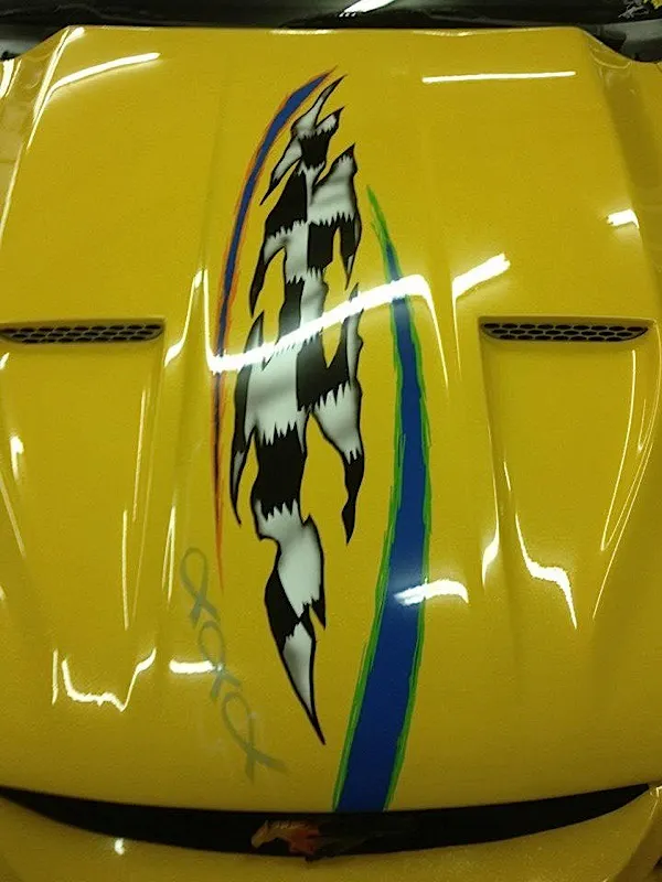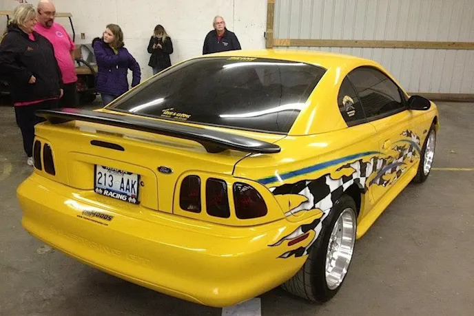 On December 24, 2012, the 1998 GT was presented to Cynthia with fresh paint in Speed Yellow with gold metal flake and graphics made possible by her Mustang family with the help of Kruiz N Kustoms in Stanford, Kentucky. There are custom graphics adding to the Sinister theme of the car, which include three ribbons, one for each cancer diagnosis, and a flag representing her winning spirit in fighting the disease.