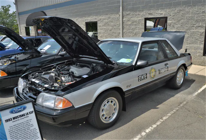 Sixteen Fox Body Mustangs participated in this show. The weather was extremely hot, and participants set up their vehicles under the shade of the surrounding trees in the parking lot. Among the most eye-catching ‘Stangs were two white 1993 LX convertibles, which looked fantastic. There was also a 1982 burgundy GT, and the sticker on the car indicated a sale price of $10,213.00. However, the most notable Fox Body was the silver and black North Carolina Highway Patrol car. North Carolina ordered 43 of these 1993 models, which were in service from 1993 to 1997.