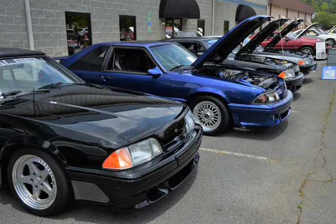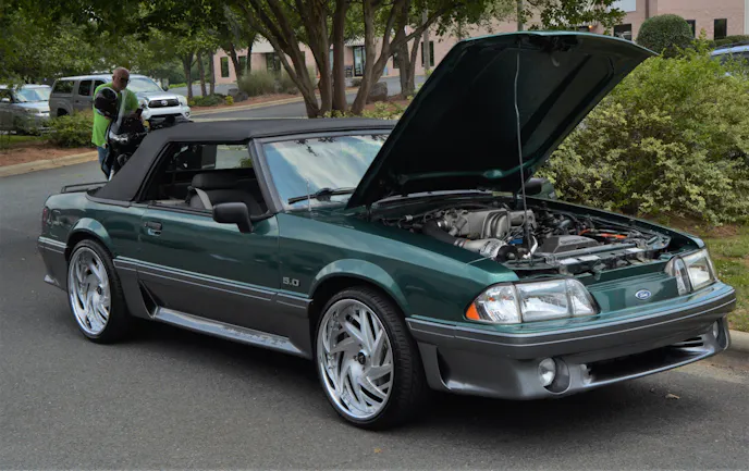 Additionally, there were both a black and a white Saleen present. The white Saleen was powered by a Boss 302 engine. One attendee showcased a stunning green convertible with striking aluminum wheels. Another standout was a silver T-Top model equipped with a roll cage, boasting a 5.0-liter engine supercharged with a low-profile blower. It’s safe to assume it could really pick up speed on the road.