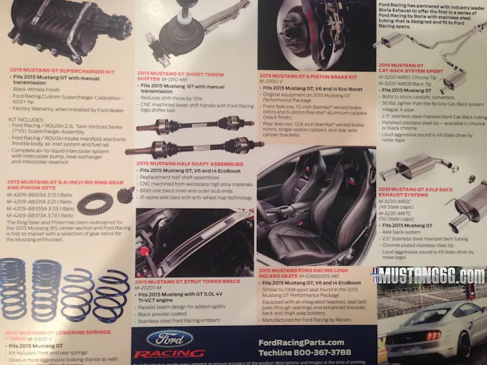 Our friends over at Mustang6g recently had a look at what is either a flyer or pages from the upcoming Ford Racing catalog. Contained within those pages are some of the top parts we suspect new S550 owners will be craving.