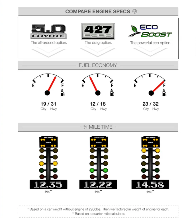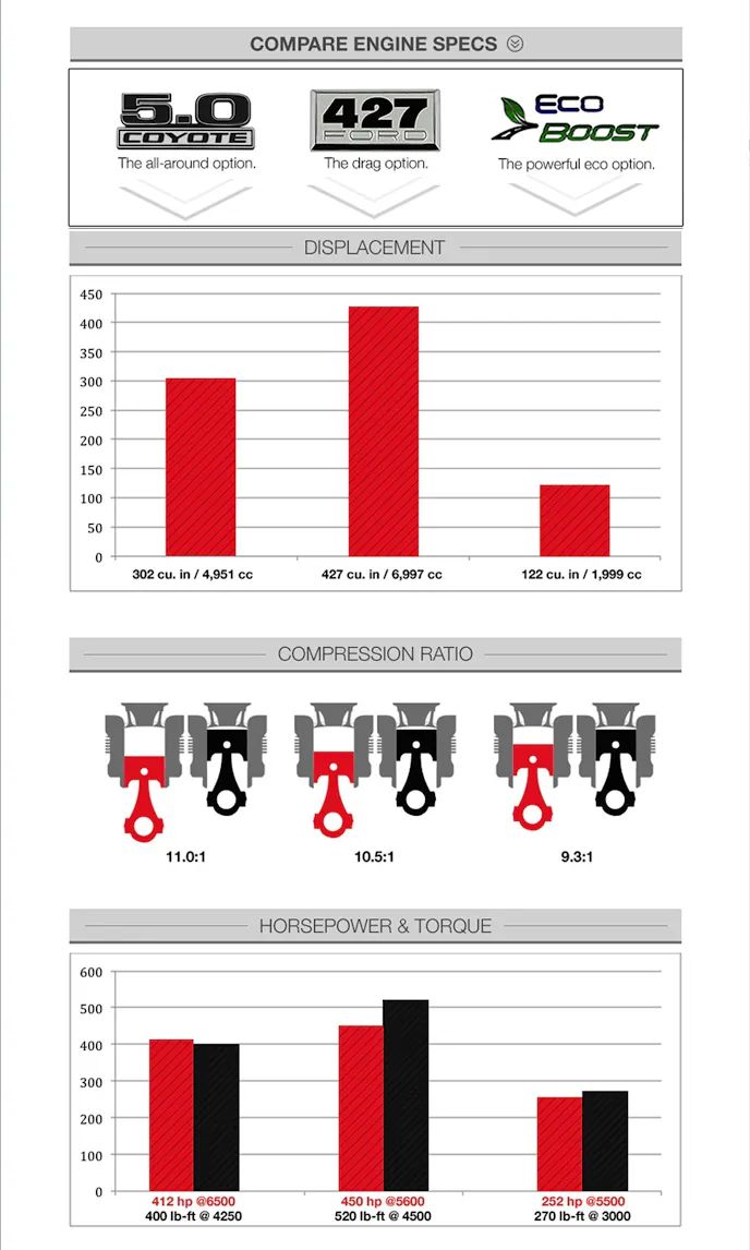 Phase 3 of the voting is now focusing on engine choice. Voters can pick between three popular Ford crate engines, each with a very different personality. The choices are: