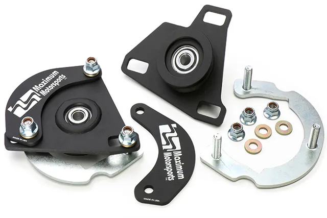Maximum Motorsports, the inventor of double-adjustable caster-camber plates for Mustangs (1993), gives S550 owners the ability to easily correct front misalignment caused by lowering. Adjustments are quickly made at the top of the strut tower. A unique spherical-bearing mount eliminates the deflection of rubber or urethane bushings and precisely locates the strut shaft, while allowing full articulation for steering and suspension movement.