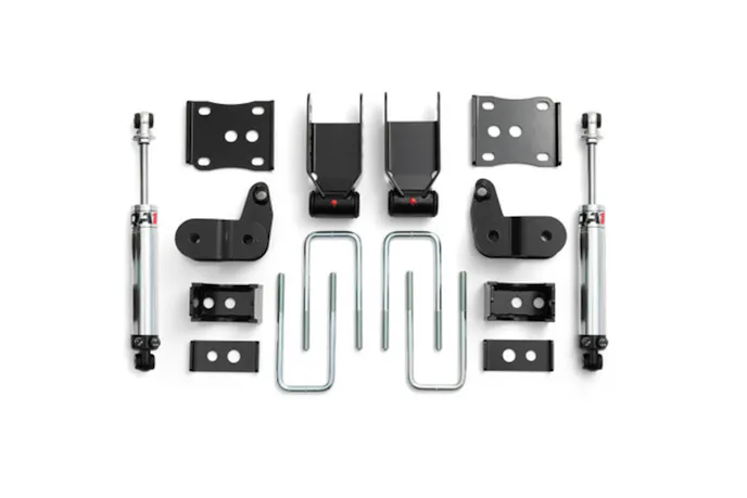 Rear flip brackets, shackle, and hanger kits are also included in the kit. These parts lower the truck’s rear without affecting ride quality (since the factory leaf springs and spring rates are maintained). Constructed from heavy-gauge steel with a powder-coated finish and quality hardware, these components, as a result, ensure lasting performance.