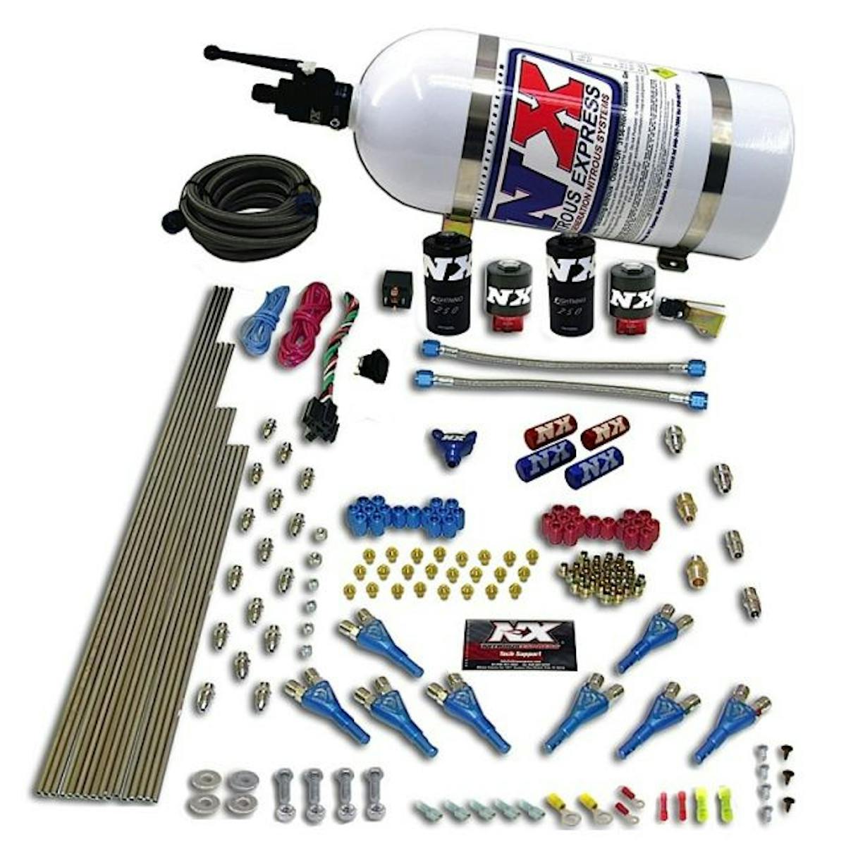 This system includes 8 of the patented NX Shark Nozzles, 2 NX Lightning 250 Nitrous solenoids, 2 NX Lightning series fuel solenoids, anodized aluminum distribution blocks, 3/16 stainless hard lines, nickel plated fittings, Jetting for 200-2100HP, D-8 stainless braided nitrous feed lines, a high flow D-8 Y fitting, a wide open throttle switch, 40 Amp relays and relay harnesses, master arming switch, stainless bottle brackets and a 15 lb nitrous bottle with the DF5 bottle valve.