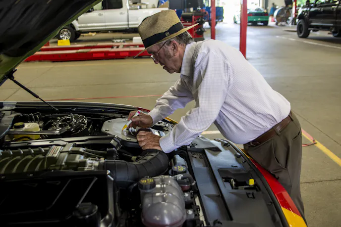 Jack Roush Sr. signs the custom “Old Crow” Mustang.
