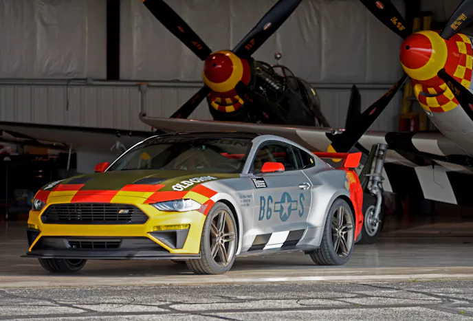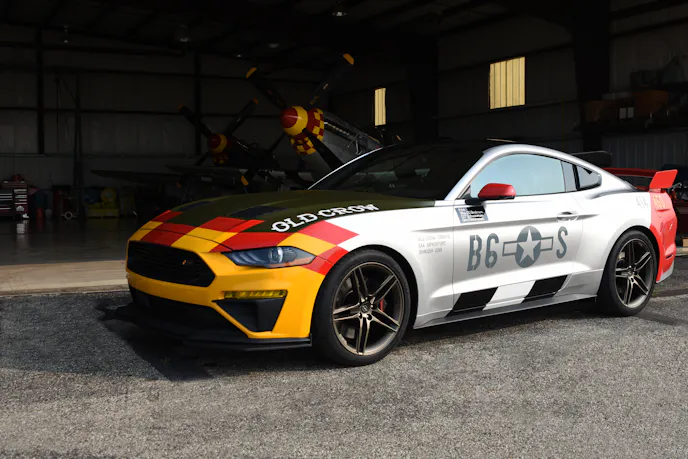 Roush Performance and Ford are honoring  World War II flying ace Colonel Bud Anderson with a charity collaboration 2019 “Old Crow” Mustang GT, inspired by the P-51 Mustang airplanes Anderson flew in combat.