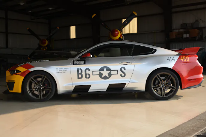 Exterior modifications include a Ford Performance front racing spoiler, a 2020 Mustang Shelby GT500 rear spoiler, Roush rear-fascia aerofoils, and anodized exhaust tips which emulate the exhaust on the P-51.