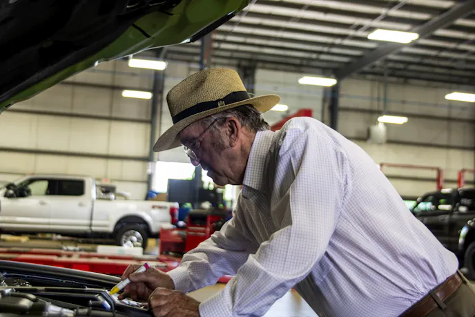 Jack Roush Sr. signs the custom “Old Crow” Mustang.