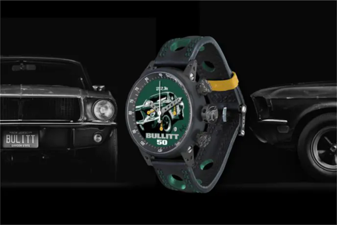 Not only does the style of this unique timepiece celebrate the movie’s anniversary, but it also contains an actual piece of the original Bullitt Mustang. The trace of movie-car DNA is a 1-gram paint fragment taken from the car and embedded in the watch.