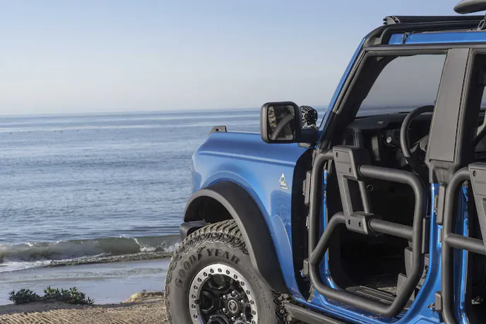 Once you get there, you’ll have plenty of options to keep you occupied thanks to numerous optional racks and mounts to help you carry all your toys. The Bronco design team came up with two prototype crossbars that are bolted to the sport bars, illustrating how overhead racks can easily be mounted without interfering with the soft tops. For Riptide, they hold two surfboards so you and a friend can both hang ten. If more wheeled action is what you crave, then the Yakima bike rack may be more your style. There are also an LED light bar and mirror-mounted off-road lights available to keep the fun going, even after the sun has set.