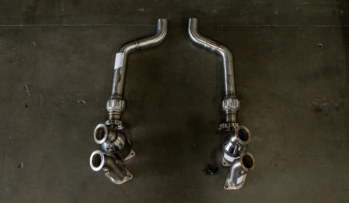 Once we returned from the track, Lund Racing informed us that our ambitions had netted us almost 300 horsepower over stock. As we patted ourselves on the back, it became evident it wasn’t a celebratory statement, but a word of caution. We were rapidly approaching the not-so-safe zone for factory catalytic converters. We decided instead of blowing out the catalytic converters that the GT500 came equipped with, we would order an aftermarket set from FabSpeed and shelve the others until the car was returned to stock or sold.
