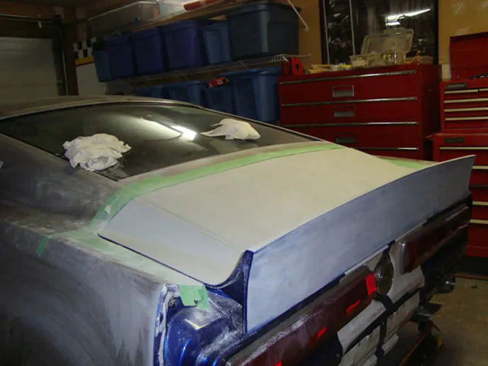 The fiberglass trunk on the Shelby’s, according to Doug, were typically ill fitting panels and he wasn’t completely happy with it. So his aim was to close the gap and have a better fit, and at the same time he decided to extend the height of the spoiler about an inch. He spent hundreds of hours doing fiberglass work, and his attention to detail shows in the pictures, as well as the finished product.