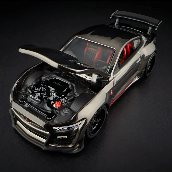 “Our latest Red Line Club choice will leave fellow collectors envious and your action figures asking for the keys,” says the Mattel website. “Its opening hood smoothly reveals what makes it the king of Shelby Mustangs, and pays tribute to an incredibly rare street-illegal star. Only 30 were manufactured by Ford, so you’ll have a better chance of getting our first-ever die-cast edition, and for a fraction of the 1:1 car’s cost.”