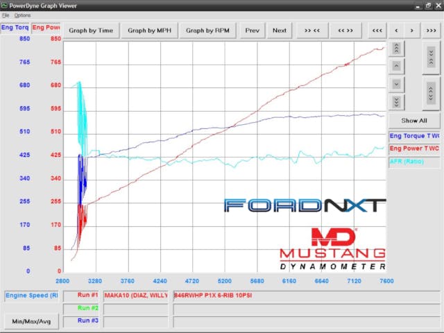 Obviously the ample fuel supply required some changes to the calibration as well, but what’s impressive is the new rear-wheel numbers were attained at the same 10-psi level as the previous gasoline-burning numbers, so there is likely still more on the table as the MAK crew keeps leaning on the latest Mustang.