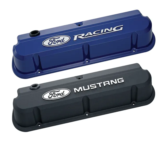 The raised and milled logos leave no doubt that you’re a Ford Racing fan, and these attractive valve covers are available in Black Crinkle (#302-135), Ford Blue (#302-136), Cast Gray (#302-137), Polished (#302-138), Chrome (#302-139) or with the Mustang logo in Black Crinkle (#302-140). These Ford Racing valve covers come with baffles, grommets and a pair of unique attaching bolts. (Not for use on engines with EFI manifolds)