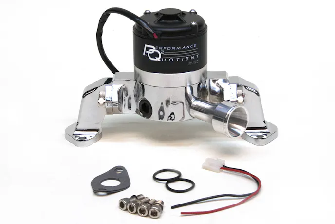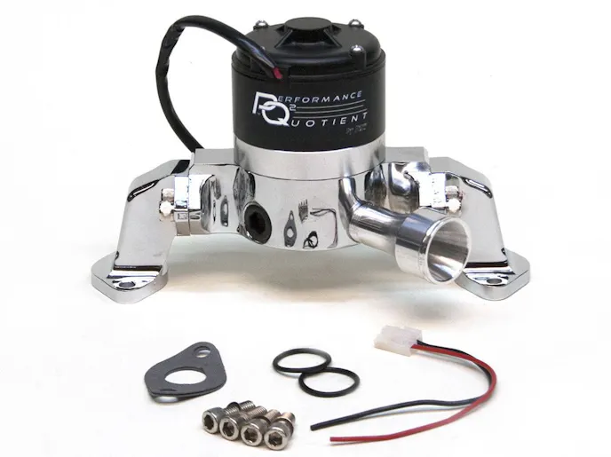 PRW announces their brand new Performance Quotient Series Chrome High Flow Electric Racing Water Pumps. These pumps were designed to alleviate the power drag produced by conventional pulley drive units. A heavy duty electric motor, turning at approximately 1,500 rpm, is more than adequate to fulfill cooling needs without draining horsepower from the engine.