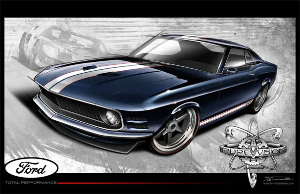 That’s not to say the Mustang can’t draw some inspiration from the GT40. Pure Vision Design has released this sketch of an upcoming concept car based on a 1970 Ford Mustang fastback.