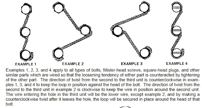 There are many combinations of safety wiring with certain basic rules common to all applications. When bolts, screws, or other parts are closely grouped, it is more convenient to safety wire them in series. The number of bolts, nuts, screws, etc., that may be wired together depends on the application. Drilled bolt heads and screws need not be safety wired if installed with self-locking nuts.