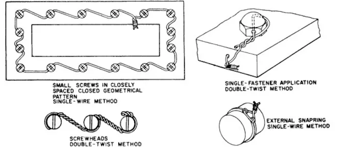 The single strand method of lock wiring may be used for some applications, such as in a closely spaced, closed geometrical pattern (triangle, square, rectangle, circle, etc.) parts in a system.