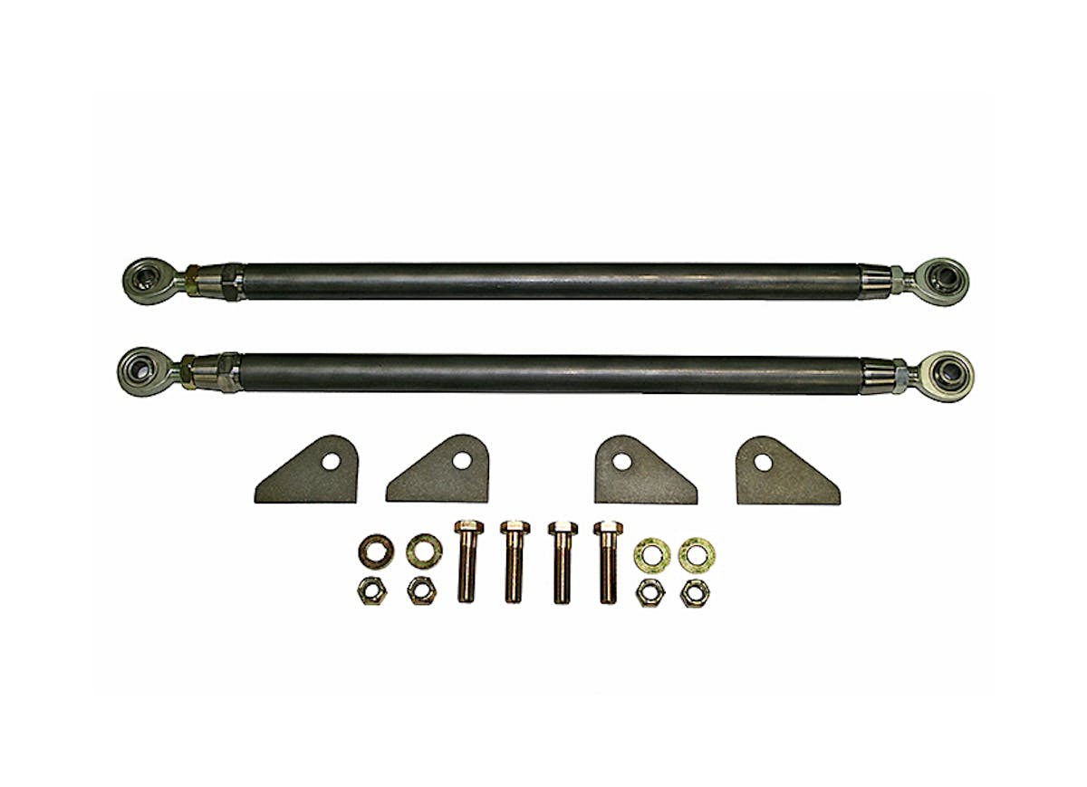 This kit uses left and right hand tube adapters and rod ends, with the left hand tube adapter having a hex on it. This makes for an easy way to put a 1/4 turn of pre-load on the axle tubes. It comes with all the hardware to bolt it to the cast center section as well as the tabs that get welded to the axle tubes.