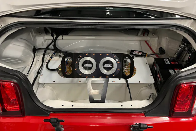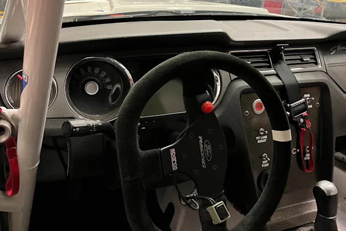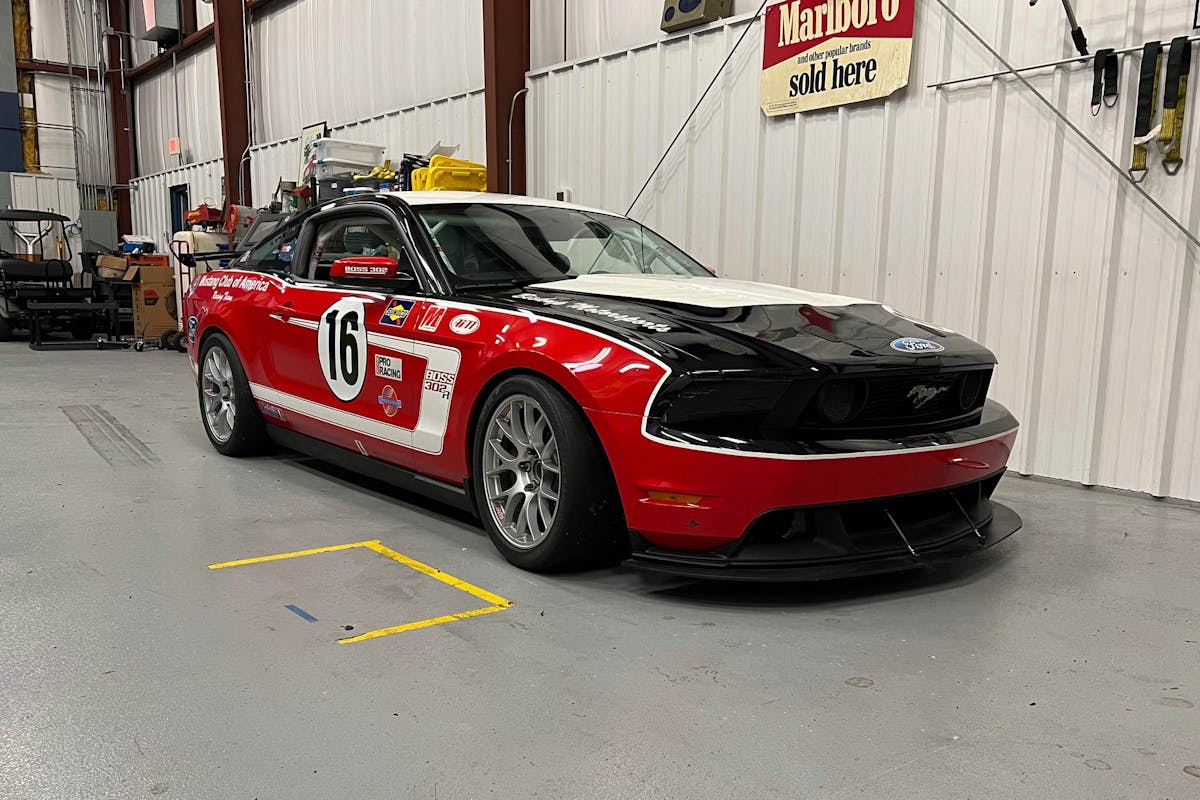 The Boss 302R exterior is painted in brilliant red and white, adorned with Laguna Seca and Mustang Club of America graphics. The interior features minimalist amenities, including a roll cage, Sparco steering wheel, and a center console used as a control panel. The trunk now houses a fuel cell and a relocated battery, shifting the weight over the rear wheels. Needless to say, this horse has a racing pedigree that can handle Circuit of The Americas as well as Laguna Seca with ease, given the right driver behind the wheel.