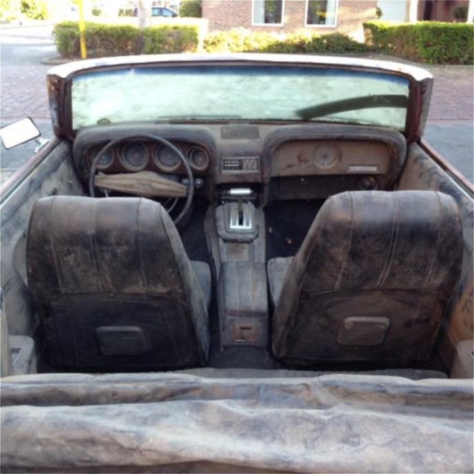 It would seem the 1970 model in question was converted with this system, but hasn’t gotten much further. Once 351-powered, this machine currently lacks an engine. Though it has just over 22,000 miles on the clock, the convertible looks like its been driven through the bottom of a muddy river and could definitely use a complete restoration. It is allegedly a red with a black leather interior, but you wouldn’t be able to tell by looking at it.
