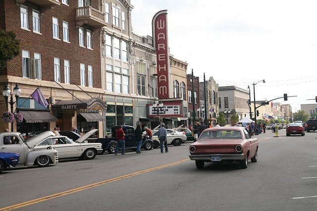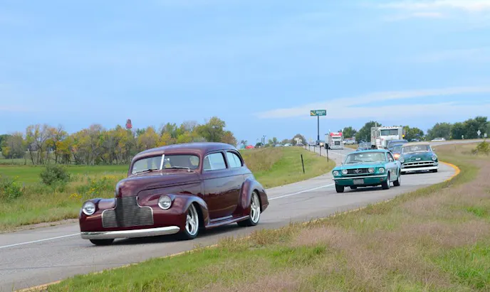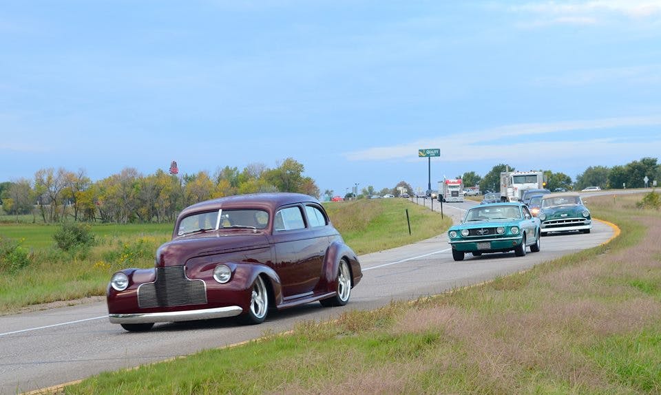 Day 7 of the Goodguys Road Tour started out in Lincoln, Nebraska with a light rain that eventually subsided and was replaced with a warm welcome from the cozy little town of Manhattan, Kansas, where the city blocked off the main street and invited the Tour participants to park center-stage. Townspeople came out to see the cars, including a group of guys from the local tech school, whose instructor let them out just to see the show. They seemed to like my Mustang! After a few minutes of enjoying coffee and donuts with the locals we were headed to the next stop in Wichita, Kansas.