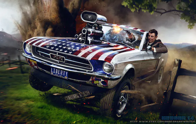 Aside from the obvious that the 40th president is running off-road piloting what appears to be a patriotically adorned, blown ’67 Mustang, possibly a nod to his time as governor of California (1967-1975), while firing a revolver out of a hole in the windshield, there’s several other nuances that make this artwork great.