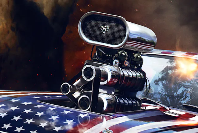 Aside from the obvious that the 40th president is running off-road piloting what appears to be a patriotically adorned, blown ’67 Mustang, possibly a nod to his time as governor of California (1967-1975), while firing a revolver out of a hole in the windshield, there’s several other nuances that make this artwork great.