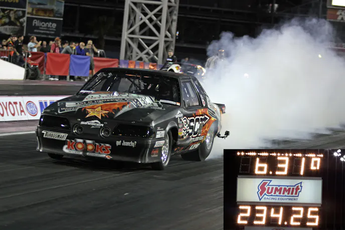 That didn’t deter him from keeping the pedal to the metal, clocking a 6.310 at 234.25 MPH during qualifying to land – if you can believe it – in the third position behind Nick Agostino and Ken Sihota’s 6.26 monster blasts.