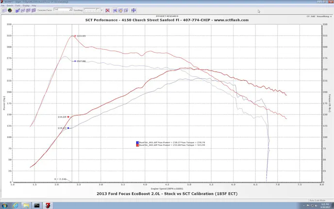 Their new tune for the Ford Focus ST promises to deliver a more than respectable 23 hp gain to the front tires, and a truly impressive gain of 45 ft-lbs of torque to the front tires over the stock calibration. What is even more impressive though is what SCT found during their research and development for their Focus ST tunes.