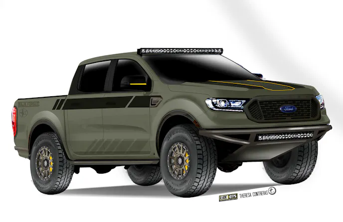 A slightly different take on the off-road theme is the Baja Forged Ranger put together by LGE*CTS Motorsports. Its twist is the addition of military styling cues.