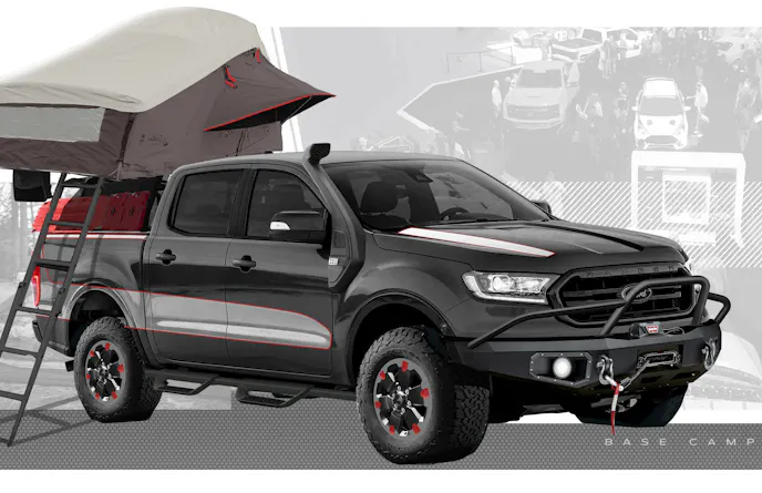 • Ford Accessories by Yakima heavy-duty rack kit by Outpost, SkyRise rooftop tent, eyebolts and load stops, heavy-duty hook straps, recovery track mount, Skinny Warrior roof basket, Slim Shady awning, Quick-click cleats and short bed tracks by SideBar