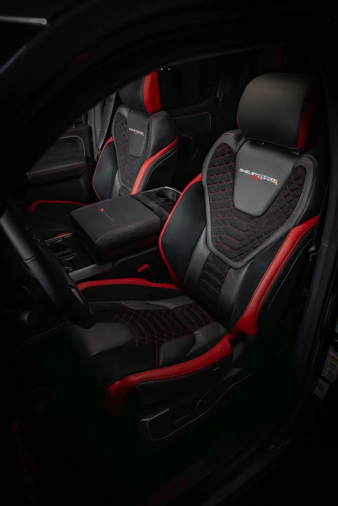- Shelby full-leather seat re-covers with “Race Red” accents