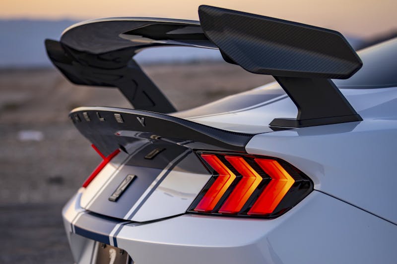 That R-model designation signals a track-focused intent, so Shelby builds on the foundation of Ford’s fastest naturally aspirated pony, the Mustang Dark Horse, which sports a 500-horsepower Gen 4 Coyote made more durable with forged rods from the most recent Shelby GT500. Topping it with a supercharger pushes the 5.0-liter engine’s output beyond 850 horsepower, which can be channeled through your choice of a TREMEC 3160 six-speed manual or 10R80 10-speed automatic.