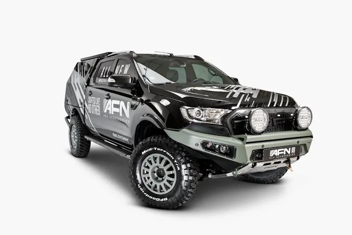 Chock full of Ford Performance Parts, this version of the Ranger is well-named. Highlights of the build include the Ford Performance-tuned Fox off-road suspension leveling kit with two inches of front lift, Ford Performance Ranger Raptor wheels with BFGoodrich All-Terrain KO2 tires, and a Ford Performance Ranger hood-hinge light kit with Rigid DSS-Series lights.