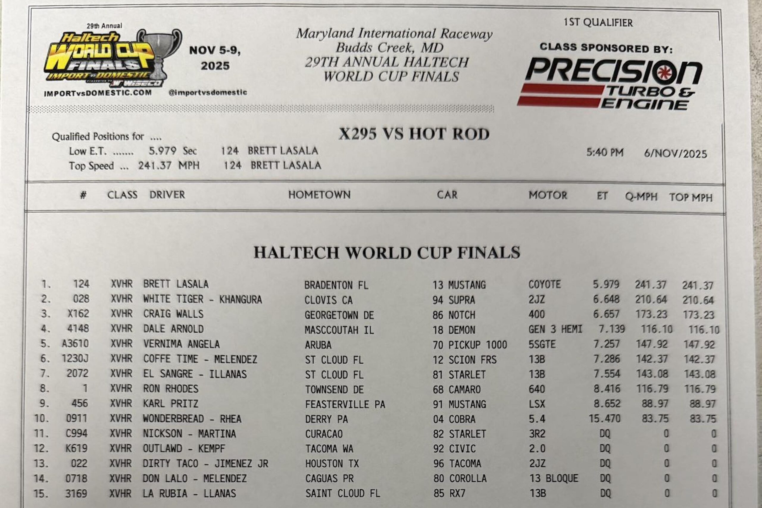 Brett LaSala broke new ground at Maryland International Raceway during the first round of qualifying at the 29th Annual Haltech World Cup Finals Import vs. Domestic presented by Wiseco, throttling his 2012 Ford Mustang, Snot Rocket 3.0, to a blistering 5.979-second pass at 241.37 mph. The street-capable machine not only blasted through the 5-second barrier but also topped the first round qualifying sheet in the X295 vs. Hot Rod class, confirming its status among the most formidable Coyote-powered Mustangs around.