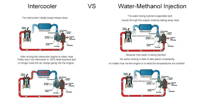 Water-Methanol Injection is a process by which a mixture of water and methanol are injected into the fuel/air mixture on the way to the combustion chamber. By injecting water and methanol in a finely atomized spray, the water evaporates under the high temperature of a firing cylinder. When the water evaporates, it takes the heat along with it. The process produces a sort of chemical intercooling inside the cylinder.