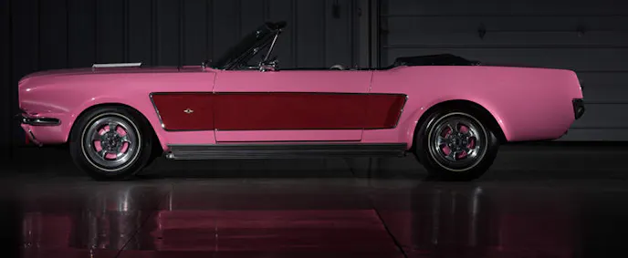 Cher’s Mustang is finished fittingly in Hot Pink — 40 coats of pink lacquer to be exact, which was a George Barris trademark. The side panels are finished in a red suede, while the interiorfeatures a white ermine fur and black Scottish leather, all trimmed out in hot pink. Hot pink fur carpeting finishes off the wild look of the interior. Cher’s car also features a one-off set of Raider custom wheels, different from those found on Sonny’s car. Besides the color, this is one of the only exterior differences between the two cars.