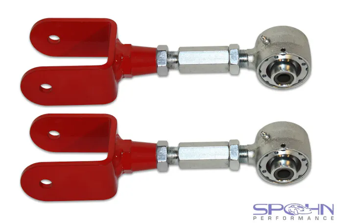 Eliminate wheel hop and increase traction with an easy bolt on installation. The adjustability feature allows for setting the pinion angle. Our right hand and left hand threaded CNC machined male/female double adjuster allows for easy on-car adjustments, no need to unmount the control arm to make adjustments!