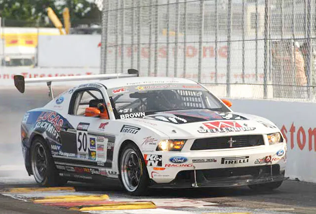The Dallas, TX native had started fourth on the grid, moving to second at the start, then chased Brown for the next 16 laps. THen Brown’s Mustang and a Touring Car entrant made contact, cutting one of the Mustang’s tires and taking it out of contention.