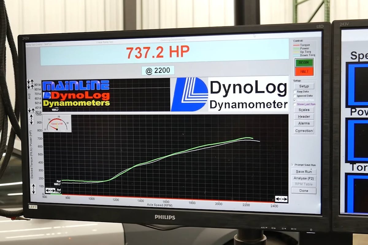 Wanting to find the absolute ceiling of the stock fuel system, one of the experts at Next Gen Performance Center added a few gallons of E85 to the tank. The results were immediate and massive. The first pull with the ethanol blend rocketed the power up to 709 rear-wheel horsepower. After another tune revision and a little more E85, the team let the car rip one last time to see what it had left. This methodical approach to tuning the ProCharged S650 paid off with a huge final number.