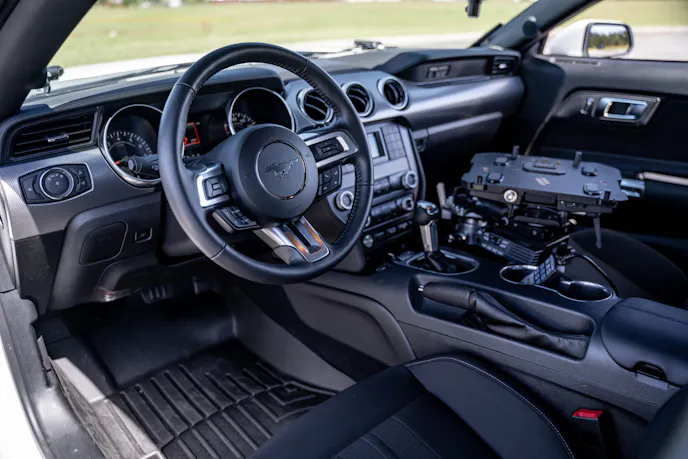 When the chase turns from open highways to twisty back roads, the Steeda suspension clocks in for work. The crew at Steeda installed its own suspension setup, including adjustable front and rear sway bar kit, IRS subframe bushing support system, IRS subframe alignment kit, IRS subframe support braces, and topped it off with a Steeda Performance wheel alignment. The base model Mustang GT came with 235-series tires in the rear, which were far from adequate for any high-performance driving. After tossing the base wheels, a set of McQueen Racing Mulholland gloss black staggered street wheels package with Nitto INVO ultra-high performance tires were installed. The Mustang now sits on a wider contact patch with 275/35/20 front tires and massive 315/35-20 rear rubbers.