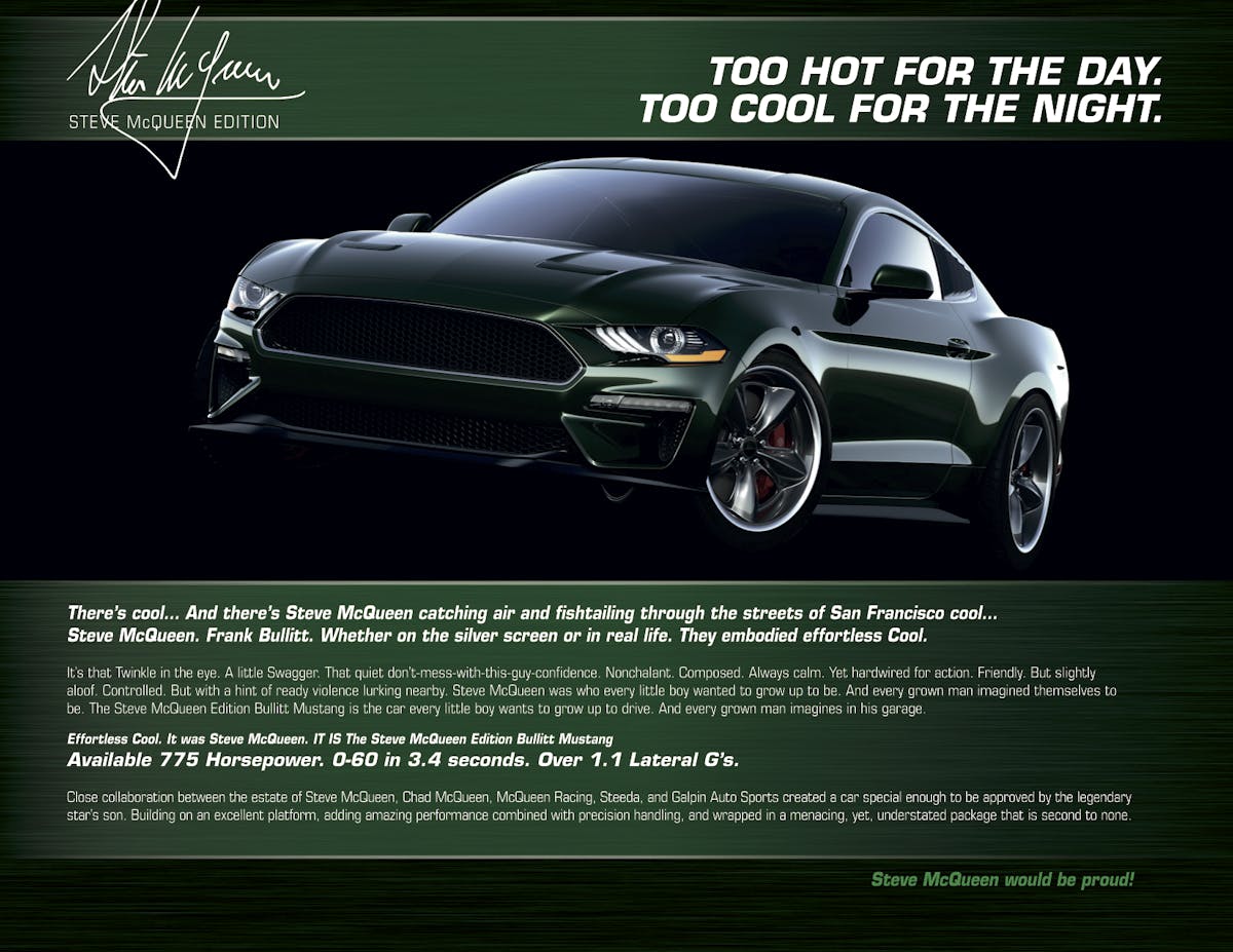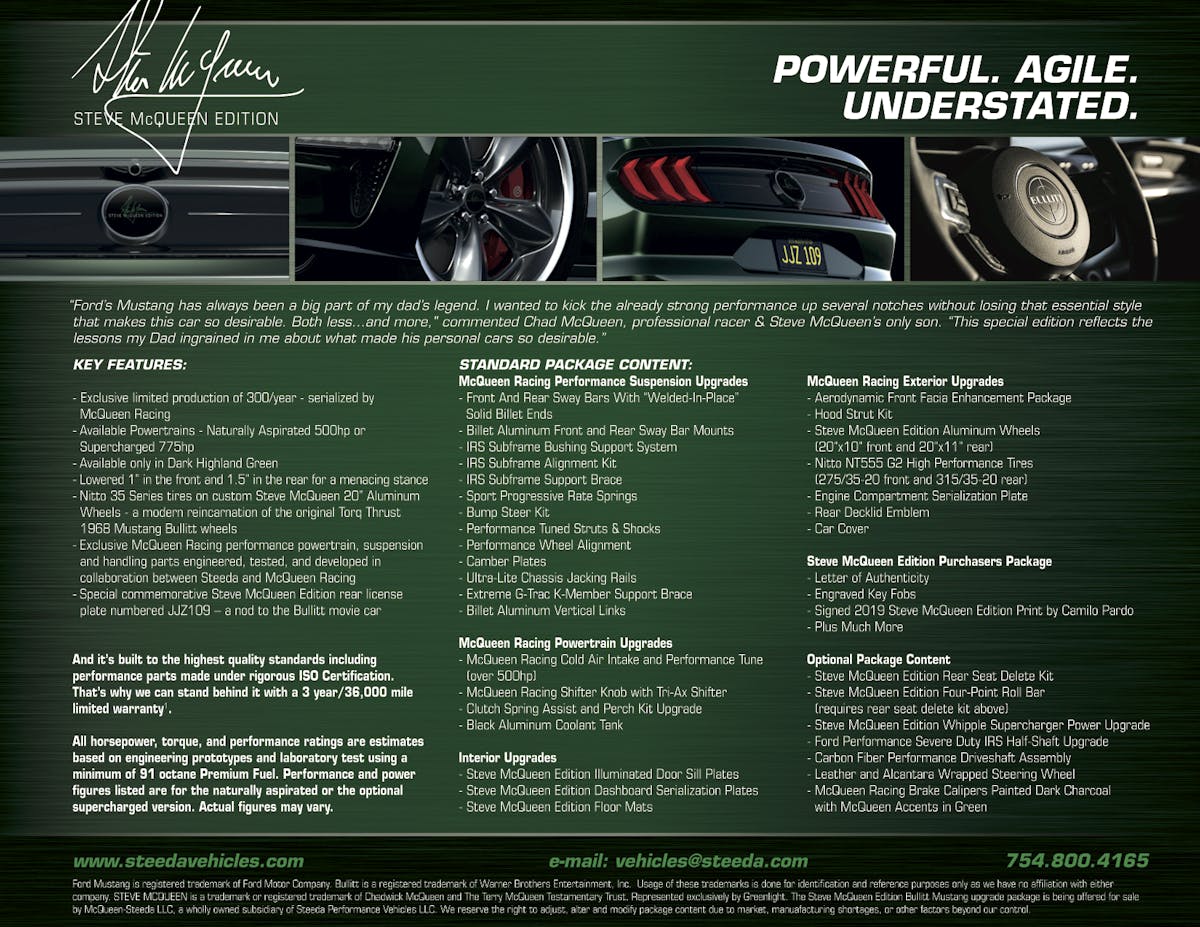 • Leather- and Alcantara-wrapped steering wheel with Highland Green center stripe $750Recently packages that detail the ordering process and options for the Steve McQueen Edition Bullitt began hitting dealer mailboxes. So, if you are in the market for something really special, have your dealer contact Steeda Performance Vehicles right here for all the details.