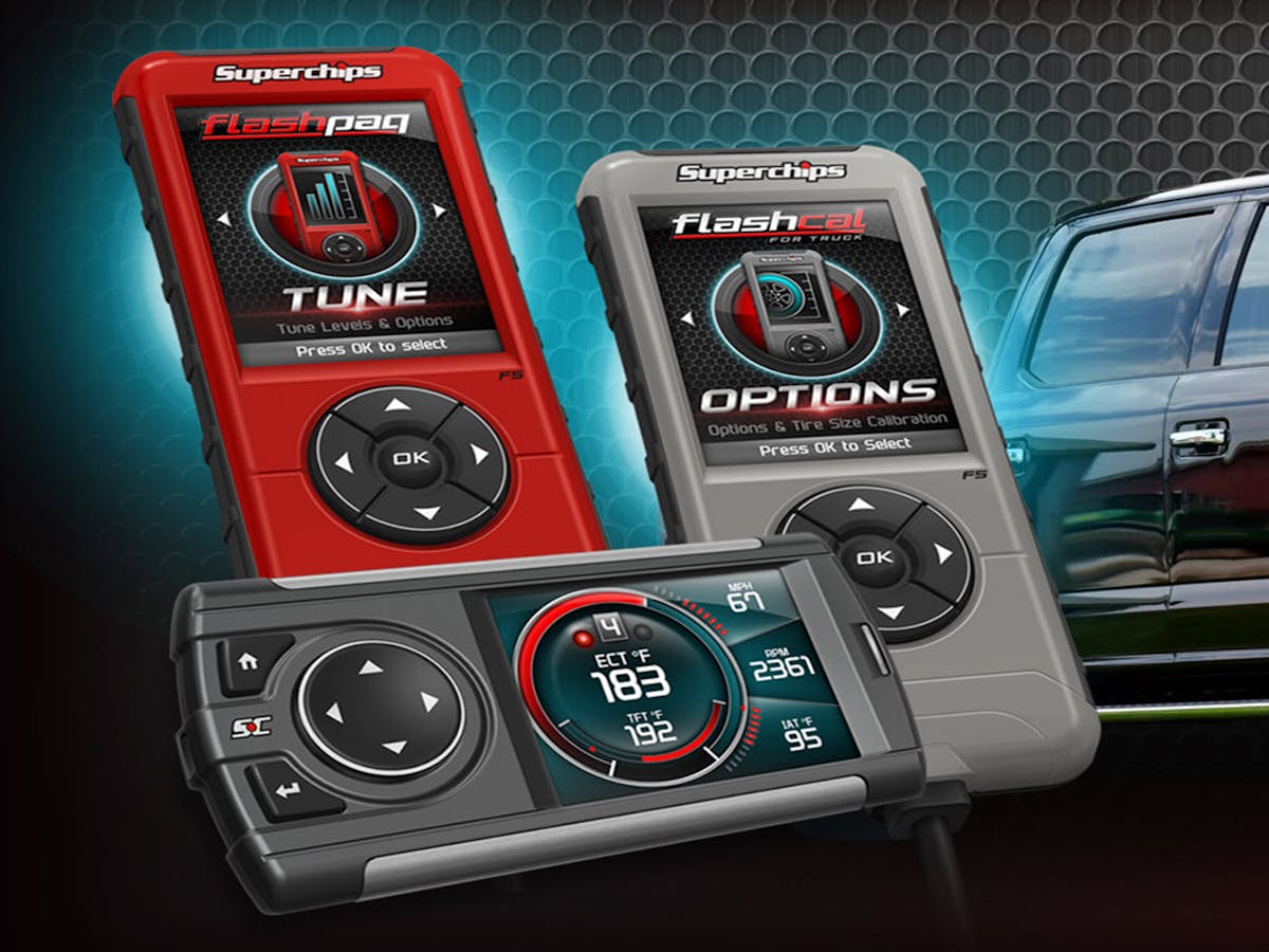 Superchips Flashpaq (handheld programmer) and Dashpaq(in cab monitor and programmer combo) offer quick, easy, and instant power for your F-150. Powered off your vehicles OBDII port (the diagnostic plug under your dash), both Flashpaq and Dashpaq are pre-loaded with custom tuned designed specifically for your F-150 year and engine. You can configure your vehicle to review each feature available for your particular Ford. In addition to performance, tow, and economy tools, both programmer options from Superchips serve as a diagnostic scan tool to read and clear trouble codes. You can also adjust your speedometer for aftermarket tires and gear swaps. Learn more about these options for your Ford today and review the power levels for your truck today.