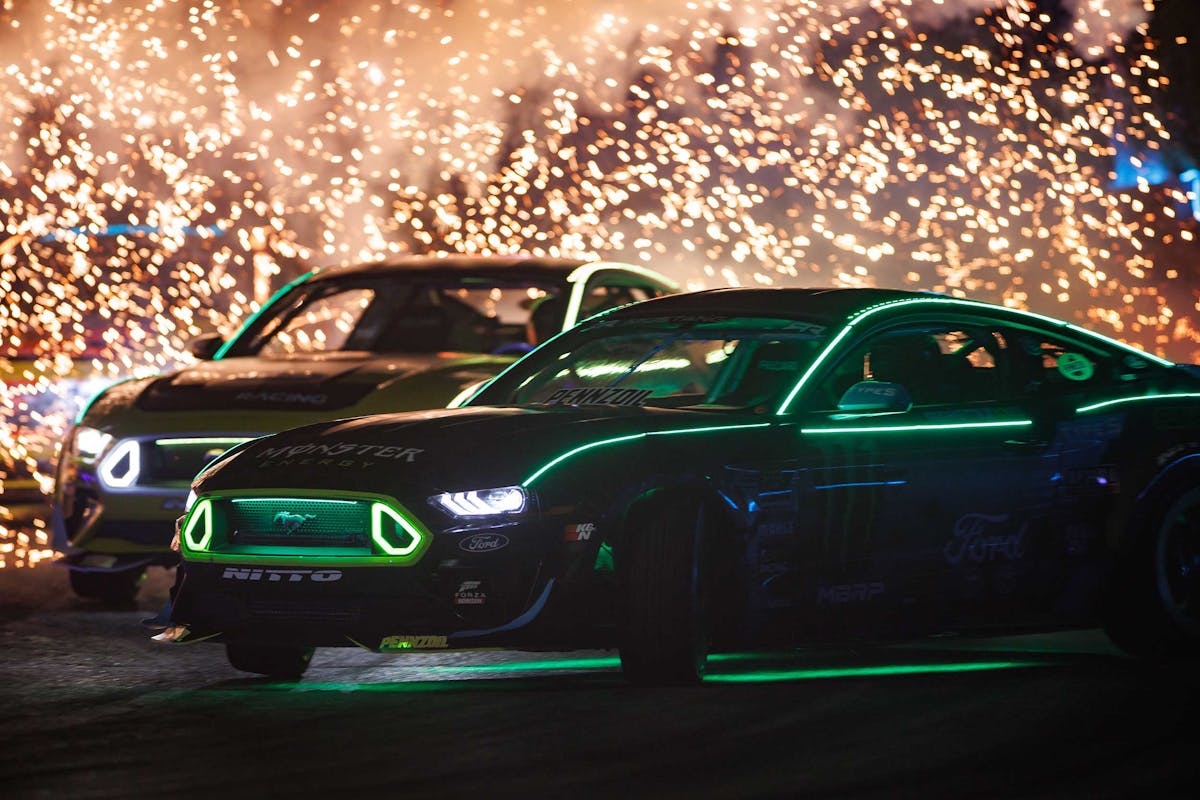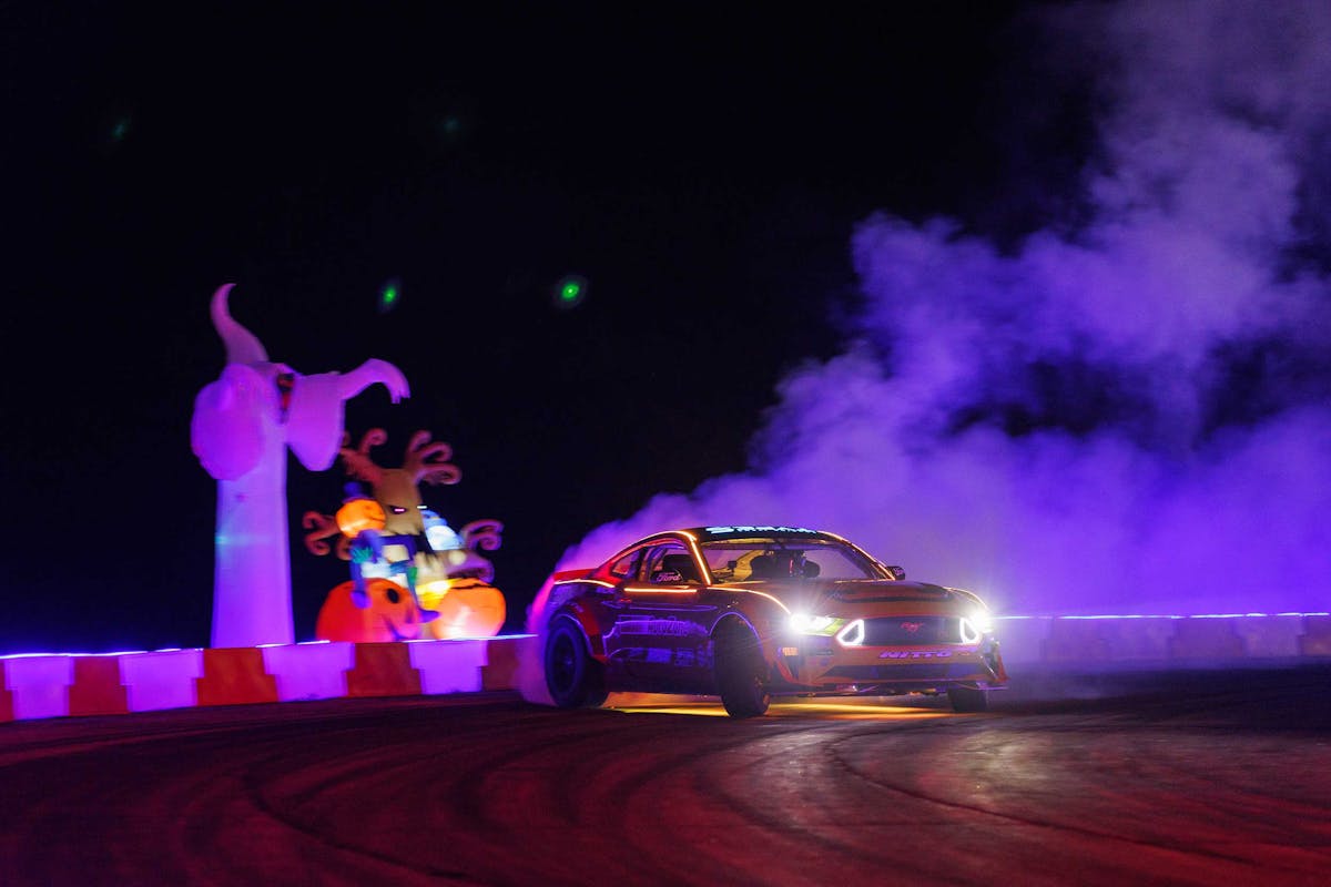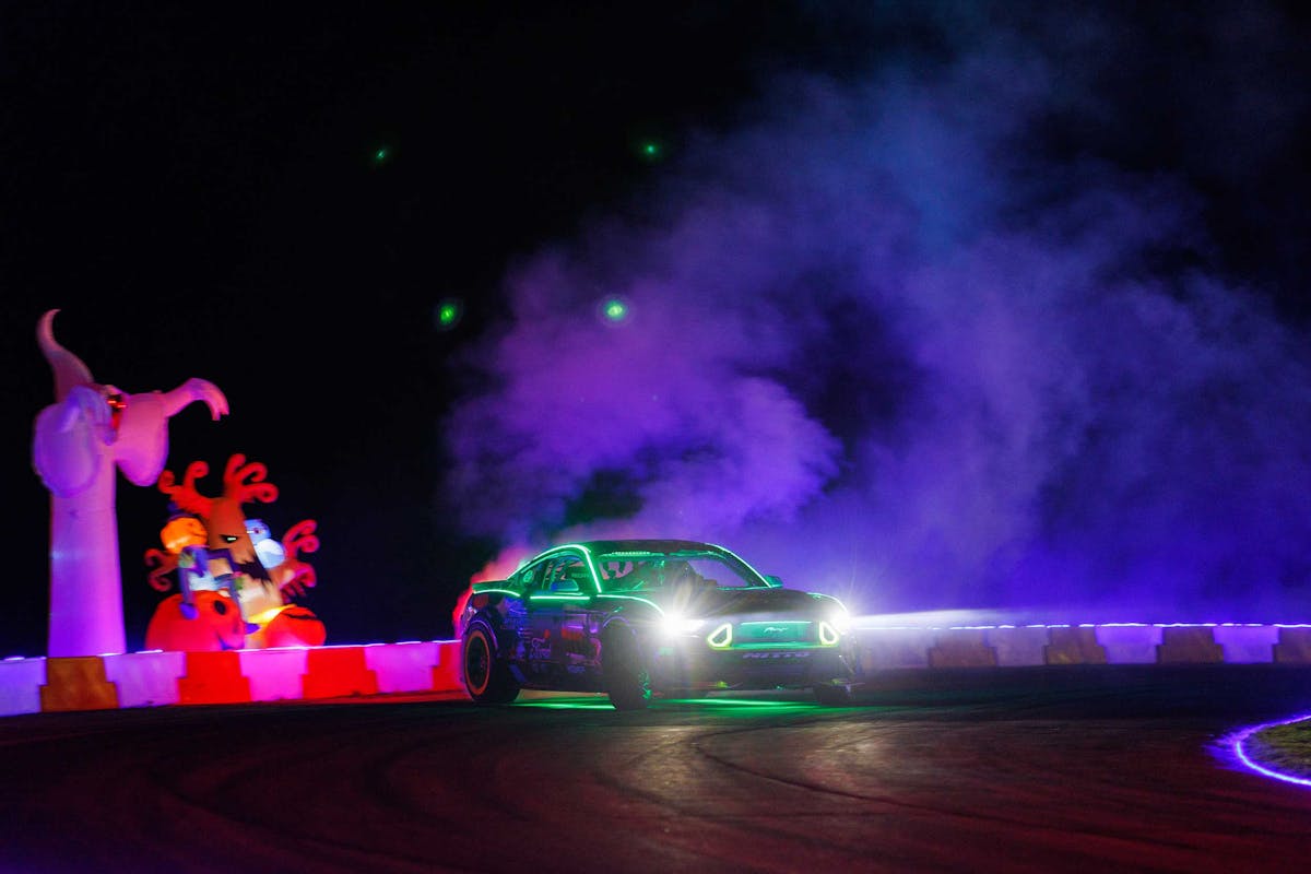 Not only do the RTR Mustangs, adorned in glowing TYPE S LED lighting, shred tires in triple tandem form surrounded by lasers and pyro, but Healy leaps over the pool and through a fence in his Bronco. All that action is set to the tune of a new T-Pain track titled Spooky Shreds (Fox Body), which name-checks both Gittin and Denofa in its lyrics.