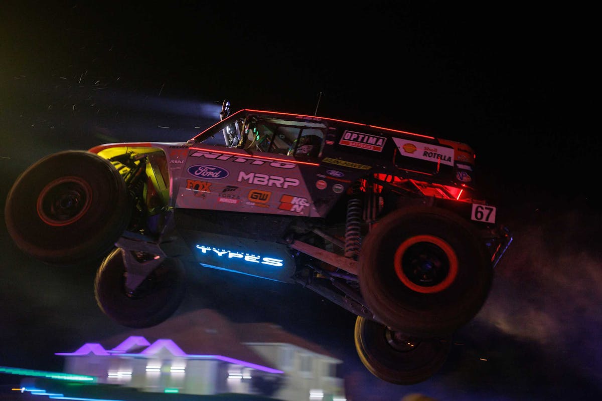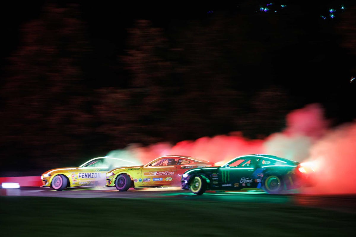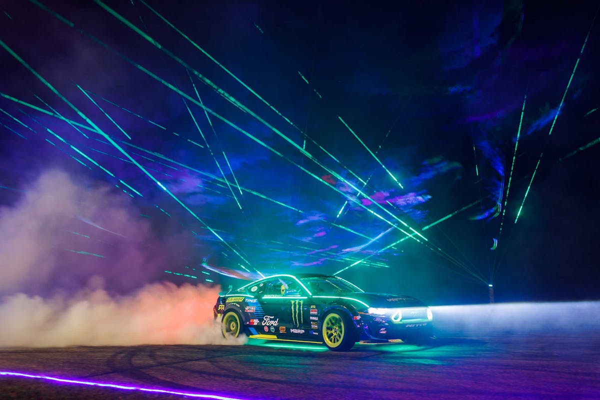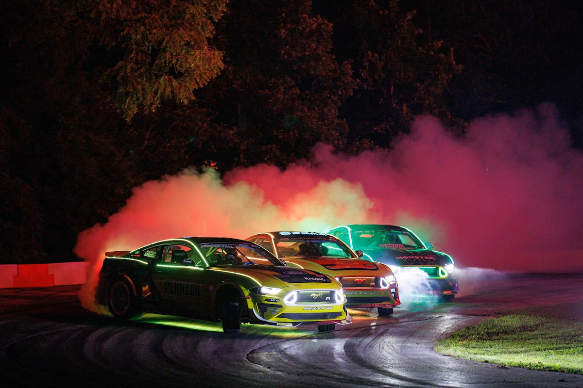 Not only do the RTR Mustangs, adorned in glowing TYPE S LED lighting, shred tires in triple tandem form surrounded by lasers and pyro, but Healy leaps over the pool and through a fence in his Bronco. All that action is set to the tune of a new T-Pain track titled Spooky Shreds (Fox Body), which name-checks both Gittin and Denofa in its lyrics.